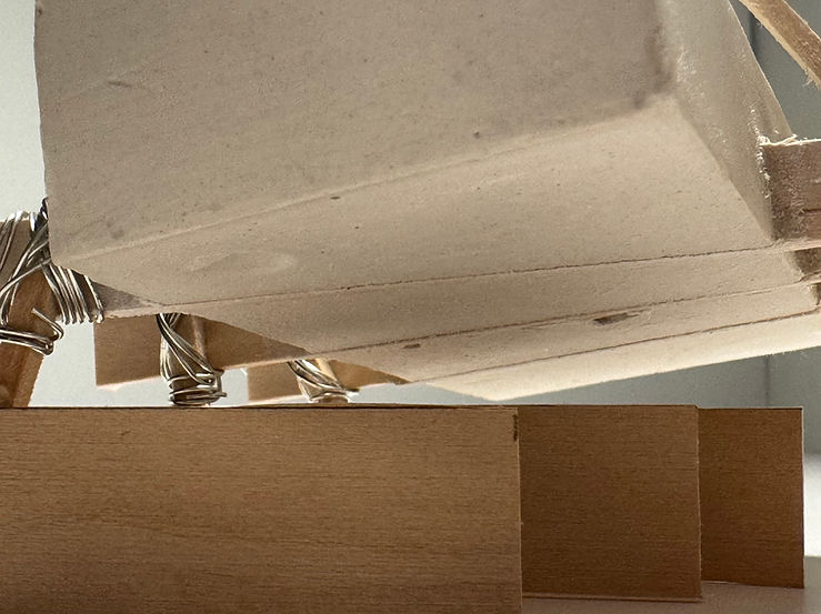 The final model combines plaster masses and wooden dowels to frame conceptual spaces around the model, joined together using a combination of wire and friction in place of adhesive.